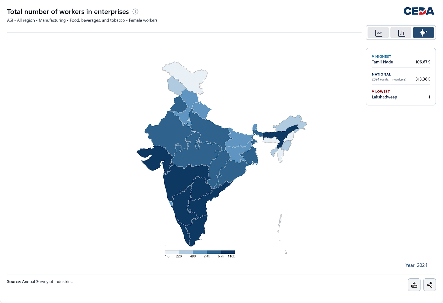Women’s employment in India’s food, beverages, and tobacco manufacturing sector is highly concentrated in a handful of states, revealing a strikingly uneven geography of industrial work. Data from the Annual Survey of Industries, visualised through CEDA’s Economic Enterprise Trackers, shows that of the 313,360 women workers employed nationally in 2024, a substantial share is located in southern India. Tamil Nadu alone accounts for more than one-third of the workforce (106,670), followed by Andhra Pradesh (52,929) and Kerala (41,089). Together, these three states employ nearly two-thirds of all women workers in the sector, reflecting strong agro-processing value chains and labour markets that have historically integrated women into factory work. Beyond this southern cluster, the numbers taper off considerably. While Maharashtra and Karnataka also host sizable female workforces, most northern and eastern states (including Bihar, Haryana, and Rajasthan) record comparatively small numbers despite their population size. The geography of women’s employment in this sector, therefore, reflects not just labour supply but where food-processing industries have matured into stable factory-based production systems that integrate women into the manufacturing workforce.